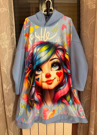 Vestido tipo sudadera con capucha – Talla única 🖤 Vestido/sudadera largo con capucha, de estilo moderno y muy llamativo. Destaca por su diseño artístico frontal con ilustración girl multicolor, estilo kawaii urbano, ideal para looks urbanos y atrevidos. ✨ Detalles: • Tejido suave y cómodo • Corte recto, estilo oversize • Mangas largas • Capucha • Estampado de alta calidad • Ideal para entretiempo u otoño/invierno 📏 Talla única (medidas aprox.): • Contorno de pecho: 130 cm • Contorno de cadera: 130 cm • Largo: 91 cm 📌 Estado: Nuevo, Queda genial con leggings, medias o botas No negociable