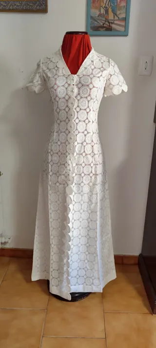 Elegante vestido vintage estilo kimono, con un diseño intrincado y delicado. - Confeccionado en encaje blanco. - Cierre de botones al frente. - Mangas cortas con detalle de volantes. - Largo hasta el tobillo. Está prácticamente nuevo. Antes de comprar inspeccione las fotos son parte de la descripción. Medidas: Largo 140cm, contorno cintura 80cm y de hombro a hombro 37cm. Talla XS