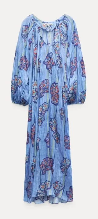 Vestido largo vaporoso estilo túnica con estampado floral, detalle de hilos metalizados, cuello redondo y manga larga amplia acabado en puño. Cintura regulable con lazadas a los laterales. Tiene forro interior. Talla GRANDE Talla XL Zara ZW Collection