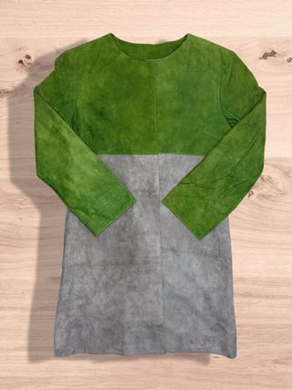 Una pieza impresionante de VIKAVI, diseñadora especializada en artículos de piel de alta calidad. Este abrigo-vestido (o túnica larga) de ante auténtico presenta un elegante estilo color block, que combina un vibrante verde abeto con un atemporal gris carbón. Su corte impecable en forma de A evoca una estética chic sesentera/vintage. Material: 100 % ante de cabra, muy suave al tacto y de alta calidad. Corte: Corte en A, escote redondo minimalista y manga larga. Color: Bicolor verde y gris. Estilo: Ideal con botas hasta la rodilla para un look retro o sobre pantalones ajustados. Estado: Muy buen estado general.