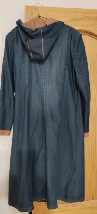 Túnica o vestido largo de estilo vaquero, con detalles en contraste y capucha. - Diseño largo. - Capucha integrada. - Cierre de botones. - Combinación de tejido vaquero y marrón. Es de la talla 44, pero se ajusta mejor a la talla 42