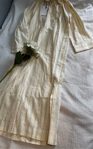 Precioso vestido midi de Zara estilo tunica color beige amarillo con detalle de bordado y botones laterales. De lino. Talla S