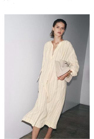 Vestido estilo túnica de Zara, perfecto para un look casual y cómodo. - Diseño de rayas finas. - Cuello con detalle de lazada. - Mangas cortas abullonadas. - Largo hasta los tobillos.