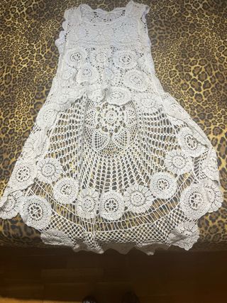 Espectacular vestido túnica de crochet asimétrico.Con diferentes largos:por delante las corto y por detrás se alarga más, dándole mucho estilo a la prenda. De la marca Mosnova. Talla Única. Ideal para vestir, con un vestido lencero debajo; o incluso para bañadores debajo. Tiene mucho usos. Nuevo a estrenar