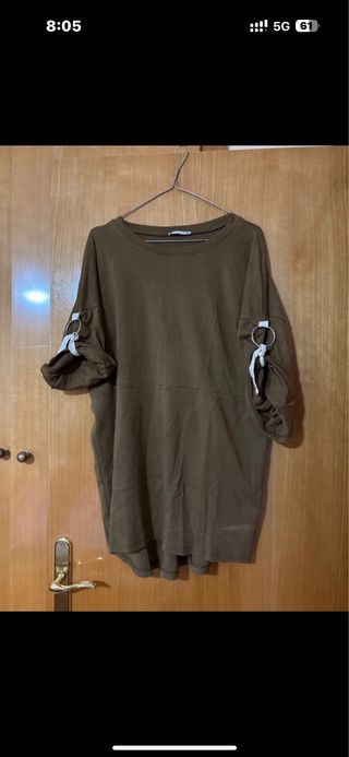 Preciosa túnica de Zara en color verde oliva. Es una prenda cómoda y estilosa, perfecta para cualquier ocasión. - Talla única - Diseño de manga tres cuartos con detalles en las mangas - Corte holgado