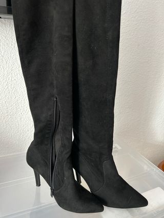 Botas de tacón alto y camal alta negras, elegantes y como nuevas. Altura del tacón ideal para un look sofisticado y estilizado. La caña llega por encima de las rodillas, perfectas para combinar con vestidos o faldas en eventos especiales o para un estilo urbano chic. Apenas usadas, en excelentes condiciones. Talla 37. ¡Un must para cualquier amante de la moda!”