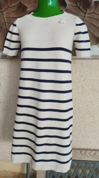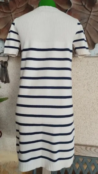 Vestido canesú Tintoretto en un elegante color crudo/blanco roto con rayas azul marino. Ideal para un aesthetic sofisticado y atemporal, estilo old money o coquette. De manga corta y cuello redondo, presenta un sutil detalle de borlas en el pecho que le añade un toque único. En muy buen estado. La talla es una S, pero el maniquí de las fotos es talla M (referencia visual). Se adjuntan medidas detalladas en las fotos para asegurar el ajuste perfecto. Vestito lavorato a maglia