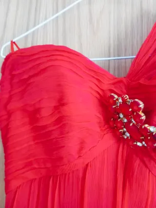 Vestido de fiesta en color rojo, con un diseño elegante y detalles de pedrería. - Adorno frontal con pedrería roja y cristal. - Tejido vaporoso con caída. - Cremallera trasera oculta. Del broche sale una gasa que puedes echar hacia atrás, quedando un estilo muy elegante.