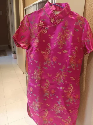 Vestido tradicional de estilo chino para mujer. - Diseño con estampado de dragones y nubes. - Cuello mao. - Cierre con botones de nudo característicos. -Talla 42 (Equivale a una XL) -Esta sin estrenar, totalmente nuevo