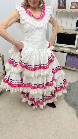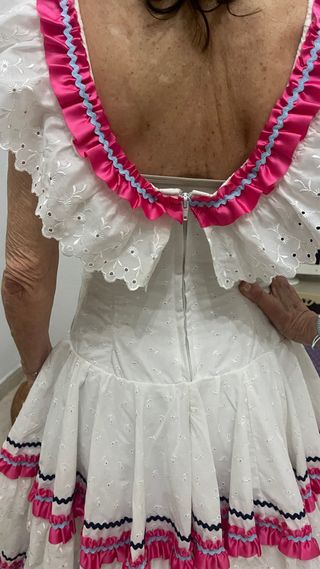 Vestido de estilo sevillana con volantes y detalles. - Diseño con múltiples capas de volantes. - Adornos de cinta rosa y negra. - Cuello con volantes y detalle de cinta. - Tejido blanco con pequeños ojales.