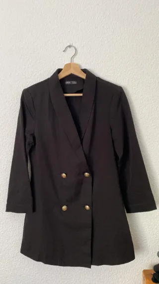 Vestido estilo blazer elegante. - Diseño cruzado con botones dorados. - Cuello solapa. - Manga larga.