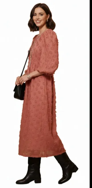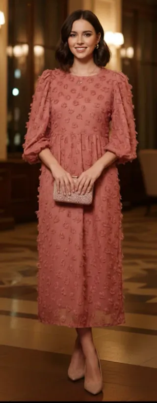 Vestido de corte midi en color rosa viejo (con un toque terracota) con una textura de flecos en relieve (tipo plumeti de flecos) que le aporta mucho movimiento y originalidad. Es una prenda muy elegante, ideal para eventos, bautizos o una cena especial. Detalles del diseño: Cuello redondo cerrado por delante. Mangas: Estilo abullonado con puño elástico para un efecto romántico. Tejido: Composición 100% poliéster tanto en el exterior como en el forro interno, lo que evita que se transparente.