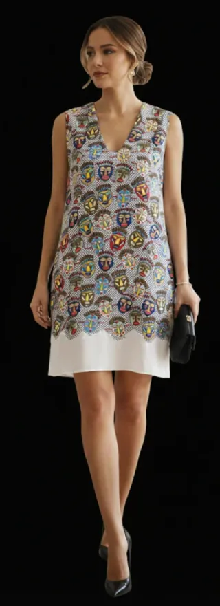 vestido recto de la marca Bimba y Lola en talla XS. Presenta un diseño único y artístico con un colorido estampado de máscaras tribales sobre un fondo de micropuntos negros. Corte: Estilo recto, sin mangas y con un elegante escote en pico (V). Detalles: Bajo del vestido en color blanco liso que aporta contraste. Cierre mediante cremallera invisible en la parte trasera. Estado: Muy buen estado, bien conservado. Medidas: Largo total: 83 cm aprox. Ancho (sisa a sisa): 44 cm aprox. Ideal para eventos de día o para un look sofisticado de oficina con un toque original.