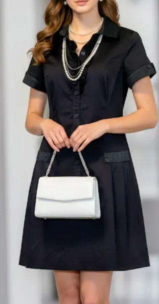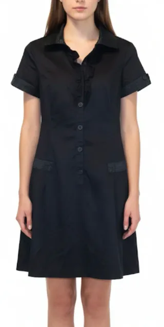 Vestido negro M-L estilo camisero de la marca Love & Love. Es una prenda muy versátil y elegante, ideal tanto para un look de oficina como para un evento más formal si se combina con los accesorios adecuados. Detalles de diseño: Cuenta con un cuello tipo solapa y mangas cortas con un acabado texturizado muy especial. La parte frontal tiene volantes delicados junto a la hilera de botones y dos bolsillos decorativos a la altura de la cadera con el mismo detalle texturizado de las mangas. Material: 100% Algodón (Cotton/Algodón), lo que lo hace muy cómodo y transpirable. Estado: En muy buen estado.Es un vestido que queda entallado