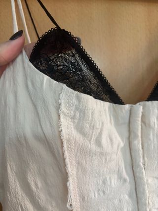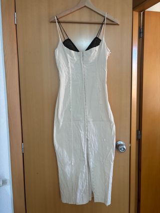 Vestido midi en color crudo con tirantes finos y detalle de encaje negro en el escote, que le da un contraste elegante y femenino. Diseño ajustado tipo corsé con cierre frontal de corchetes. Destaca por sus costuras visibles con acabado deshilachado (sin rematar), un detalle de diseño que aporta un estilo moderno y ligeramente raw. Marca: ZARA Talla: S Estado: muy bueno
