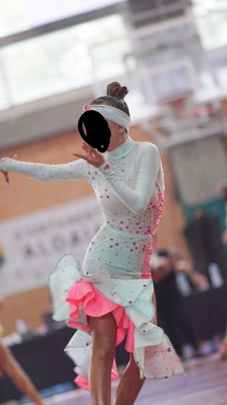 Vestido de baile deportivo de estilo latino, adornado con pedrería brillante. - Diseño con mangas largas. - Falda con volantes y detalles en rosa. - Incluye turbante y pendientes a juego. - Talla Xs/Xxs