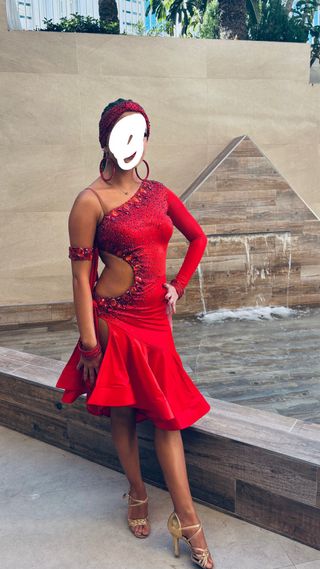 Vestido de baile deportivo de estilo latino, con un vibrante color rojo y detalles de pedrería. - Diseño asimétrico con un hombro. - Corte pronunciado en la cintura. - Falda con vuelo y abertura lateral. - Adornos de pedrería y cristales. - Incluye accesorios a juego. -turbante a juego