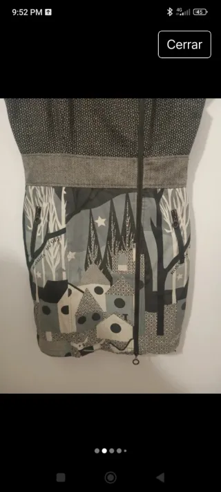 Vestido con un diseño único y original, perfecto para la temporada de invierno. - Mangas cortas. - Cuello estilo chaqueta. - Cremallera frontal. - Estampado de casitas y árboles.