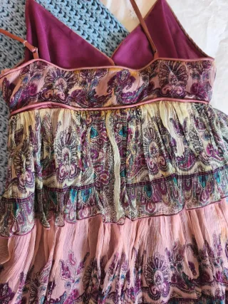 Vestido con un bonito estampado floral y estilo bohemio. Me costó 175€ en una boutique. Tiene pequeñas manchas en la espalda que seguro que se quitan fácilmente. - Diseño con tirantes. - Tejido ligero y vaporoso. - Detalle de volantes en capas.