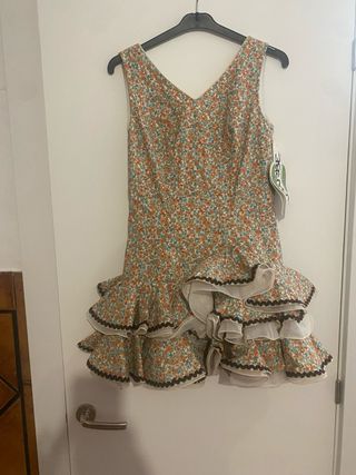 Vestido de estilo flamenco con un estampado llamativo. - Diseño con volantes en cascada. - Mangas abullonadas con detalle. - Escote en V.