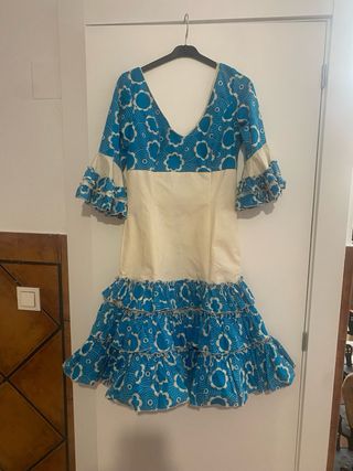 Vestido de estilo flamenco con un vibrante estampado floral. - Cuerpo superior en color azul. - Falda con múltiples volantes. - Detalle de bordes en rojo y azul.