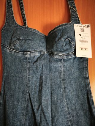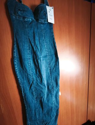 Vestido de estilo vaquero de la marca Bershka. - Diseño con tirantes. - Corte ajustado. - Tejido denim.