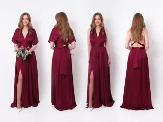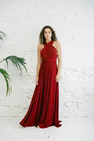 Vestido largo de estilo infinito en color burdeos. Su diseño permite múltiples formas de atarlo. Solo se utilizo una vez para una boda. - Tejido satinado. - Abertura lateral en la falda que permite que se pueda entrever un poco la pierna.