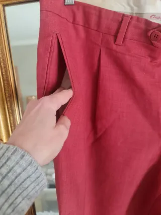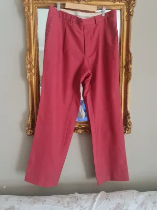 Pantalones de vestir de lana en color rojo teja Modelo de corte recto, cintura alta y estilo elegante, Presenta un talle alto con pinzas frontales, trabillas para cinturón y perneras de corte recto.