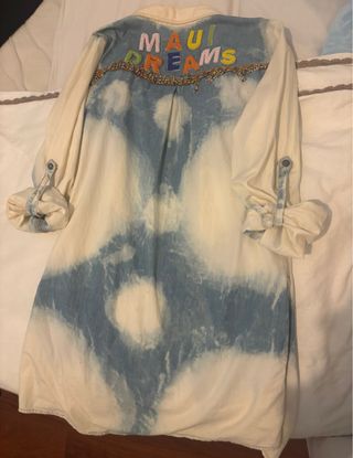 Vestido estilo camisero con un diseño tie-dye único. La parte superior presenta un bordado Maui Dreams con cuentas. - Mangas largas enrollables con trabilla y botón. - Cuello camisero. - Cierre de botones en la parte delantera.
