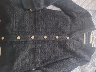 Vestido negro con un diseño elegante y detalles que recuerdan al estilo Chanel. - Cierre frontal con botones dorados. - Dos bolsillos delanteros. - Tejido texturizado.