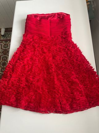 Vestido palabra de honor comprado en una boutique de A Coruña, puesto solo 1 vez. La calidad es buenisima y queda precioso puesto. La talla pone 42 pero me lo arreglaron a medida asi que talla para una XS con poco pecho. - Cuerpo fruncido en el escote. - Falda con tela efecto de rosas. - Estilo palabra de honor strapless.