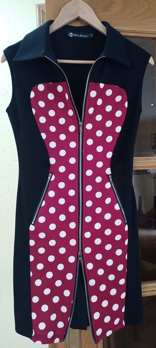 Vestido de la marca Nice Forever, con efecto de ilusión óptica. Un lado Pin Up en el estilo. El vestido se abre al gusto, tiene 2 cremalleras. Talla M. Dimensiones en las fotos.