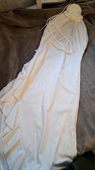 Vestido blanco elegante de corte asimétrico, con un largo que casi roza el suelo en la parte posterior y se eleva delicadamente en el frente. Con un diseño sexy y sofisticado, presenta una rosa adornando el cuello y deja media espalda al descubierto, lo que le confiere un toque seductor y único. Ha sido utilizado solo una vez para una sesión de fotos, lo que lo hace prácticamente nuevo. Perfecto para una ocasión especial donde desees destacar con estilo y elegancia.