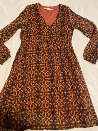 Vestido de Springfield con estampado floral estilo boho. A estrenar. - Diseño con escote en V. - Mangas largas con detalle de volante. - Estampado de flores pequeñas en tonos alegres.