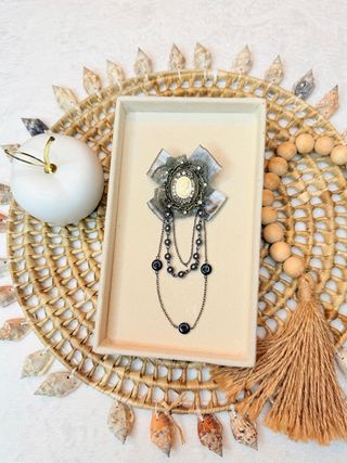 Broche decorativo estilo vintage con camafeo central, adornado con lazo de tela, detalles brillantes y elegantes cadenas con perlas y cuentas negras colgantes. Un accesorio muy original y sofisticado ideal para decorar chaquetas, blazers, vestidos, bufandas o bolsos. Perfecto para quienes aman el estilo clásico y romántico. Vintage decorative cameo brooch with fabric bow, embellished with shiny details and elegant hanging chains with pearls and black beads. A unique and sophisticated accessory perfect for decorating jackets, blazers, dresses, scarves or bags. Ideal for lovers of classic and romantic style. #joyeria #accesorios