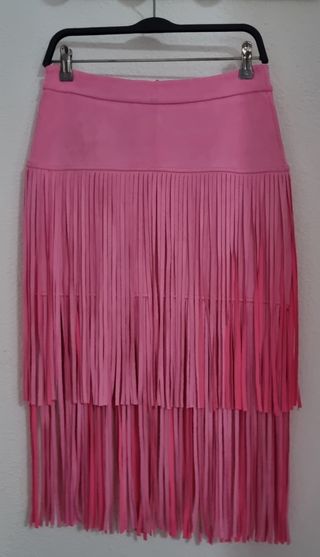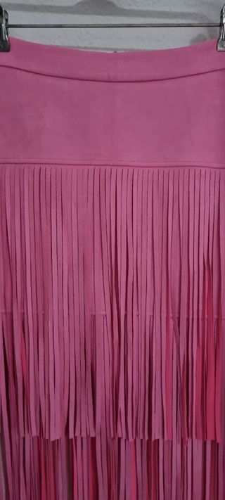 Falda con flecos en color rosa chicle. De antelina. Con 10% de elastano, lo que permite adaptarse a un cuerpo con una talla superior, ya que es bastante elástica y cómoda. Muy elegante, estilosa y multifucinacional, pues sirve tanto para vestir formal como informal. La mitad de la cintura mide 37 cm, y 46 de cadera, pero sirve para personas con más medida de cintura y de caderas por su elasticidad. Es muy bonita, y de diseño.