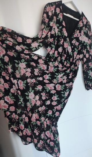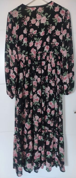 vestido de la marca pull and bear de la talla M tiene un escote redondo con la parte delantera en V el vestido es estilo trapecio se ensancha un poco a partir de la cintura con cierto vuelo lleva manguita larga tipo francesa no llega hasta abajo, el fondo es negro con florecitas rosas y verdes no lleva forro y es un punto fino con mucha caída.