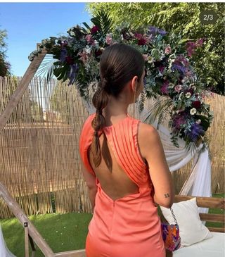 Vestido de fiesta o invitada, estilo Lady Pipa. - Diseño con espalda descubierta. - Detalle de pliegues en la parte superior.