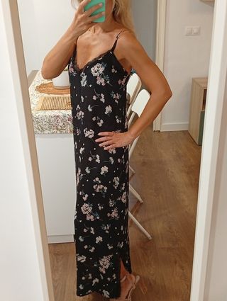 Vestido largo estilo lencero con un llamativo estampado. - Diseño con tirantes finos. - Detalle de encaje en el escote. - Abertura lateral en la falda.