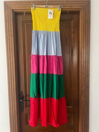 Vestido largo con un diseño vibrante y escalonado. - Cuerpo superior elástico amarillo. - Falda con secciones de color azul claro, rosa fucsia, verde y rojo. - Estilo bohemio y veraniego. - Precio original 23,90€