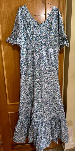 Vestido de flamenca estilo canastero, confeccionado en tela de algodón. Con forro de algodón. Muy cómodo para lucirse en romerías o ferias. Su estampado es floral en tonos azules y morados. - Mangas con volantes. - Volantes en el bajo del vestido. Con posibilidad de recoger en Ayamonte y Aljaraque.