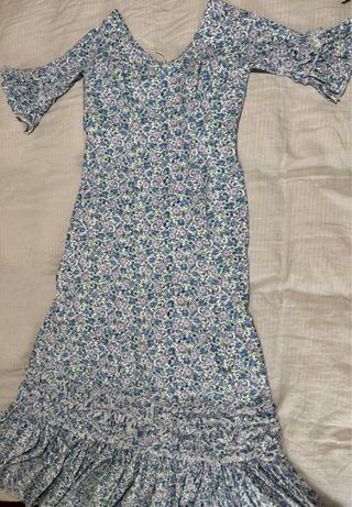 Sin estrenar. Me está pequeño y no puedo devolverlo. Falda estilo clavel. Medidas: Pecho 93 Cintura 75 Cadera 101 Largo cuello-suelo 152. Regalo mantoncillo buganvilla que le va genial.