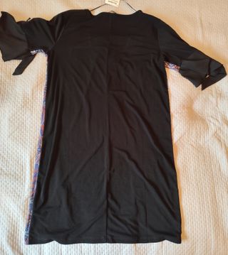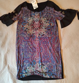 Vestido con estampado estilo mandala en la parte delantera. Parte trasera y mangas negras. Las mangas son cortas y tienen un detalle de lazos. Talla L de Desigual. Sin estrenar, conserva etiqueta.