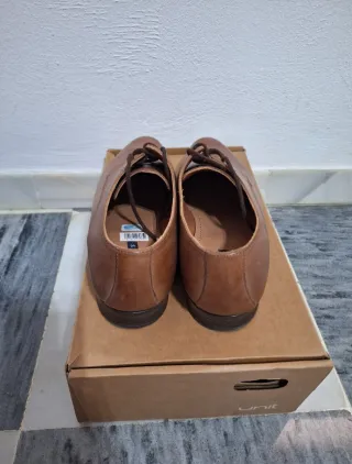 Zapatos de vestir de la marca UNIT, color marrón, talla 40. Estilo clásico tipo Oxford, ideales para eventos, trabajo o vestir formal. Usados solo una vez, están en buen estado. Destacar una pequeña mancha apreciable en el pie izquierdo (ver foto). Muy cómodos y elegantes, combinan con traje o con vaqueros más formales. Se entregan con su caja original.