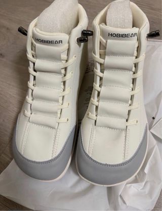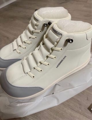 Zapatos estilo botín de la marca Hobbiebear en color blanco con detalles grises. - Diseño minimalista. - Cierre con cordones de goma - Suela flexible.. Muy cómodos, horma ancha. Absolutamente nuevos a estrenar. Se vende por error en la talla