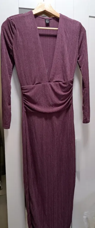 Elegante vestido gris con un toque brillante, perfecto para ocasiones especiales. Su diseño cruzado y drapeado le da un estilo único. - Diseño cruzado en el escote. - Falda drapeada con abertura. - Mangas largas. Precio 4.50 euros no negociables ✔ No se aceptan ofertas. ✔ Solo venta por envios ✔ Contesto rápido y envío en menos de 24 horas