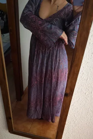 Vestido largo con estampado paisley en tonos morados y azules. Presenta un escote en pico y mangas largas acampanadas. - Estampado paisley. - Mangas largas acampanadas. - Escote en pico.