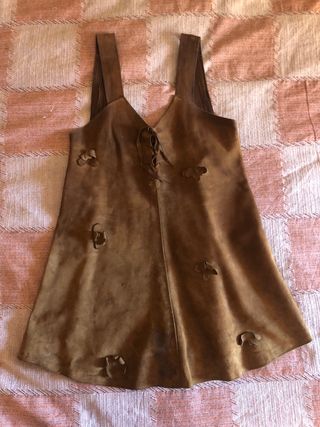 vestido mini de ante marrón con cordones, similar a los estilos vintage de las décadas de 1960 o 1970. Signos de desgaste del ante por los años. - Material: Ante - Color: Marrón - Adornos florales aplicados - Cierre de cordones en el escote - la talla es orientativa mirar las fotografías con las medidas