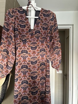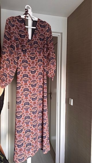Vestido de Zara estampado estilo boho - Diseño con volantes en el cuello. - Mangas largas abullonadas. - Cierre de botones en la parte delantera. - Cintura elástica. - Falda con volantes en capas.