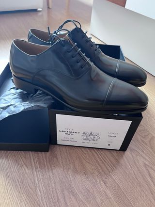 Elegantes zapatos de vestir modelo Travis de la marca BOW-TIE. Nuevos sin estrenar, perfectos para ir con traje, y ceremonias. - Color: Antick Black. - Estilo: oxford - Talla: 9 UK - 43 EUR - material: piel boxcalf exterior, interior de piel - PVP: 230€ Se compraron para una celebración, pero al final no puede asistir, por eso están nuevos. Oportunidad de comprar unos buenos zapatos de vestir a magnifico precio